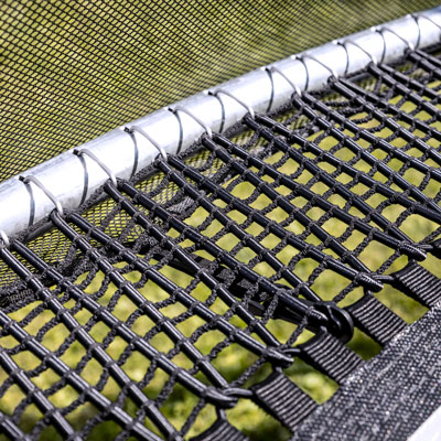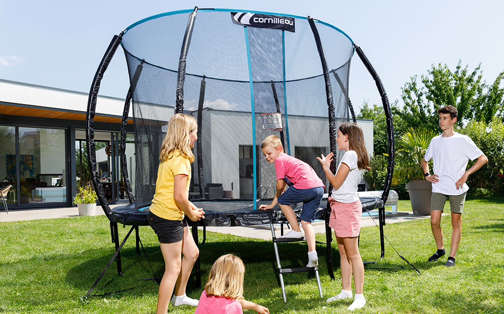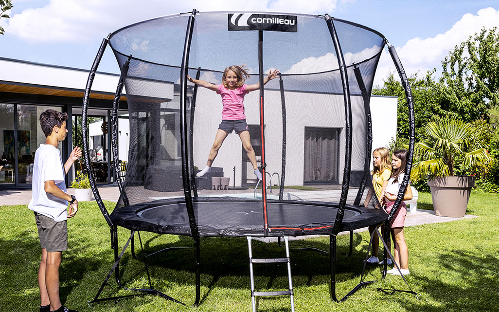 Com as suas molas localizadas fora da zona de salto e os seus dispositivos de proteção concebidos de forma inteligente (rede, almofada de proteção, postes curvos), o trampolim Spring proporciona um óptimo nível de segurança.